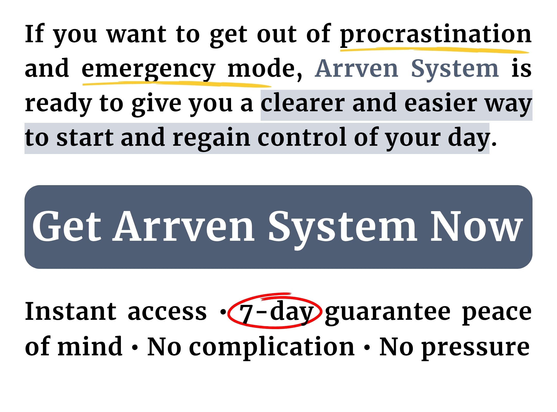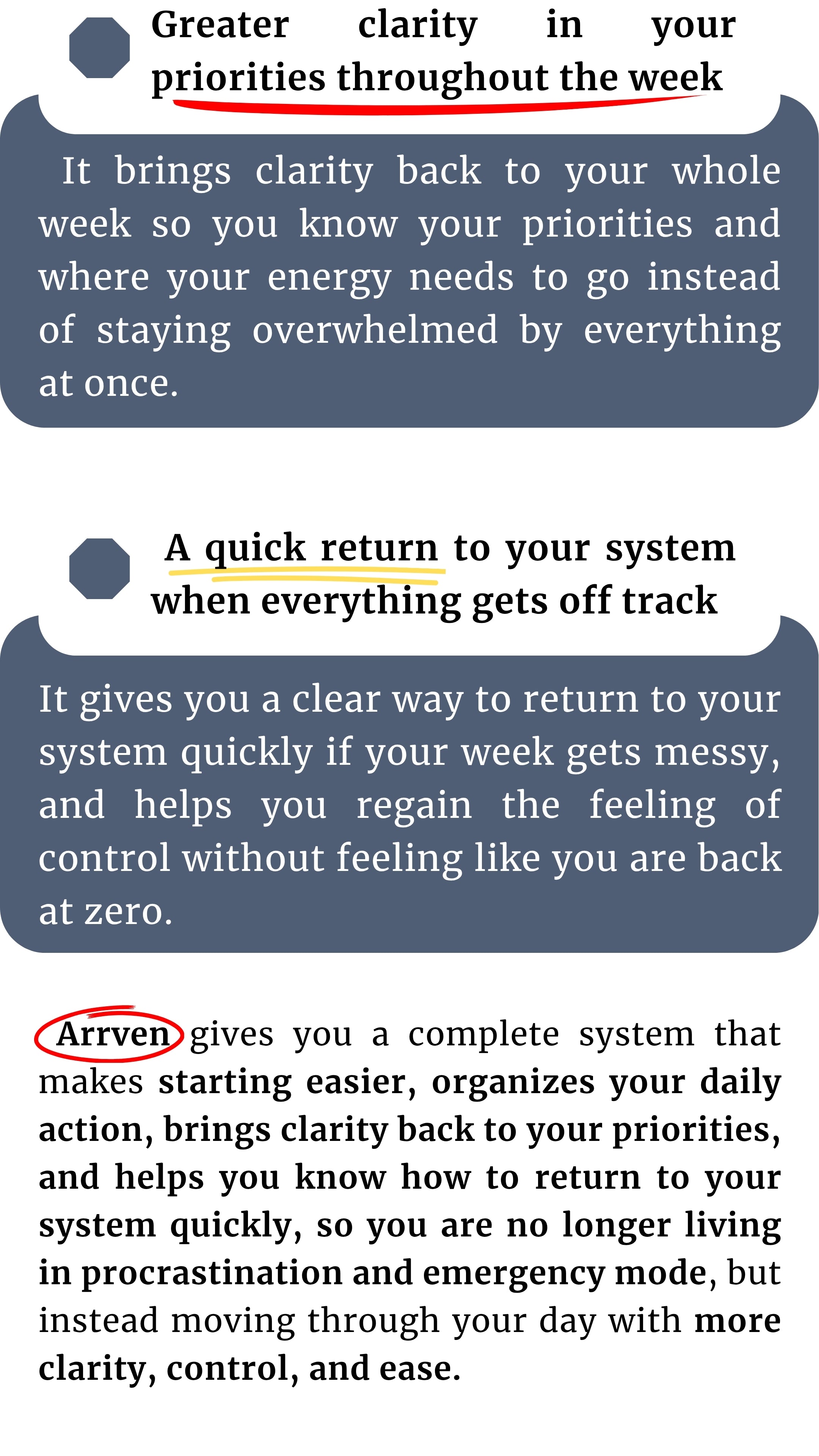 Arrven does not only help you start the task, but also keeps helping you organize your day, clarify your priorities, and return quickly to your system if a day or week gets off track.
